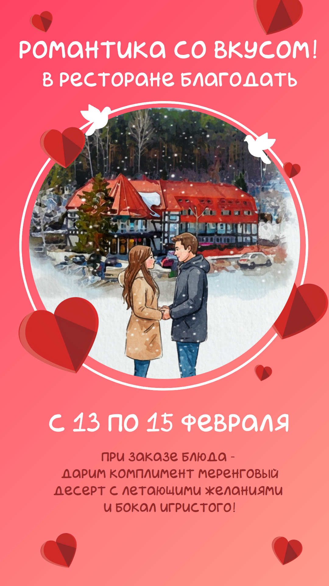 Друзья, мы рады предложить вас специальные акции в ресторане Благодать в период с 13 по 15 февраля:
